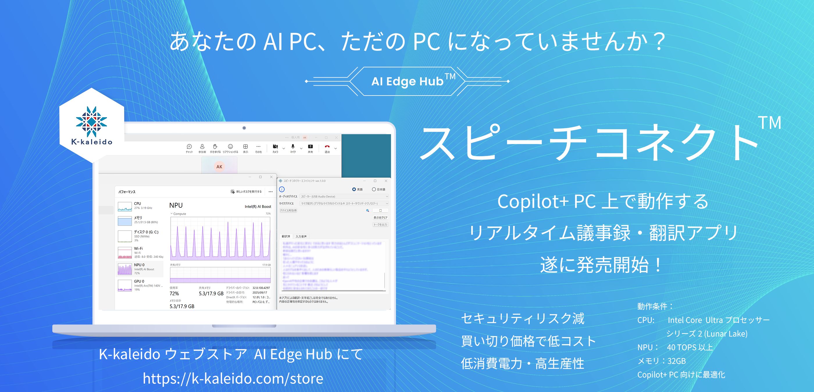 AI PC専用ストア「AI Edge Hub™」をオープンし、完全オフライン議事録アプリ「スピーチコネクト™」の提供とPoC募集を開始しました。